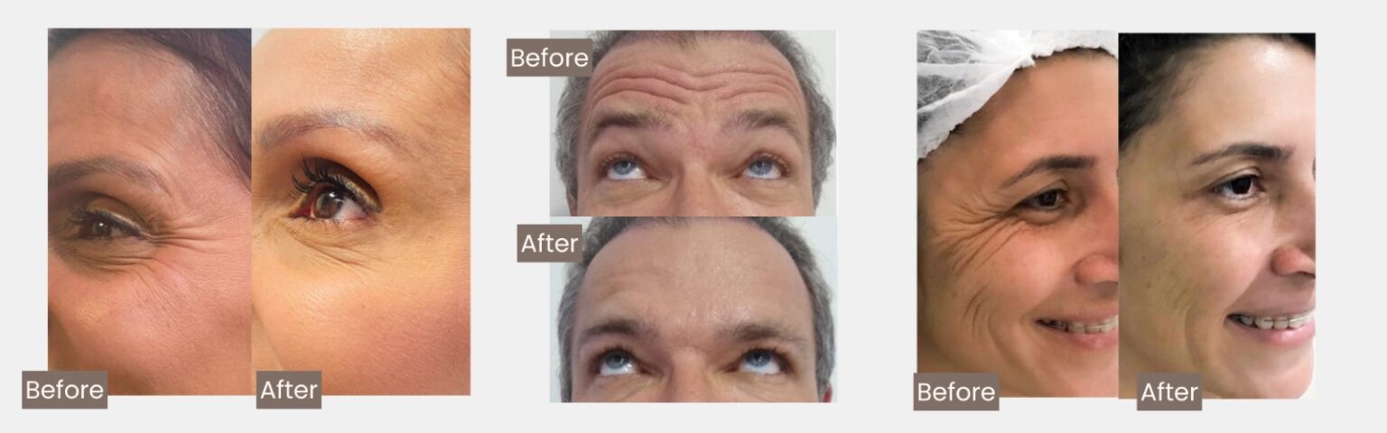 • Softens wrinkles and expression lines, especially on the forehead, frown lines (glabella), and around the eyes (crow’s feet).
